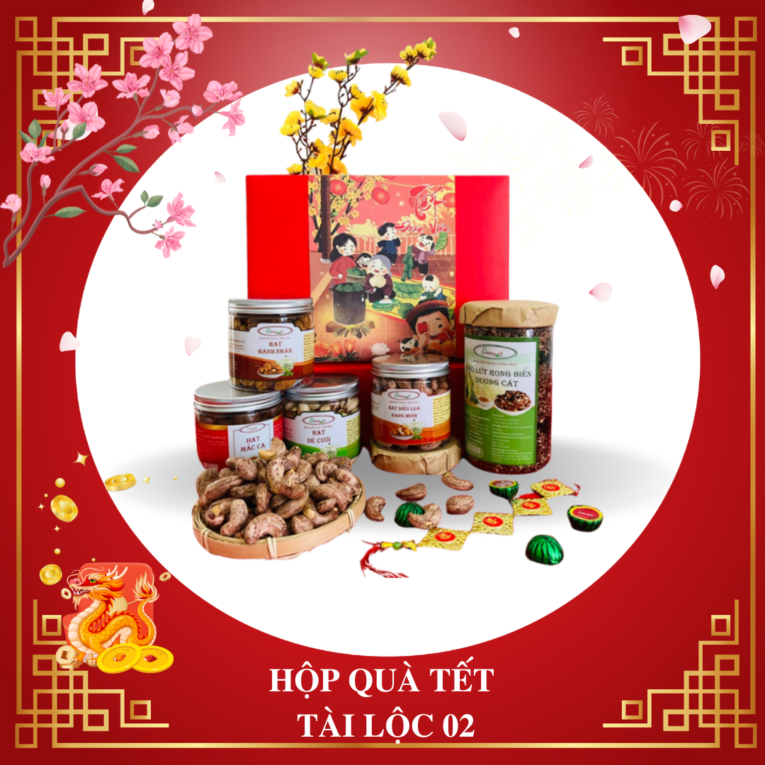Hộp Hạt Dinh Dưỡng Tặng Tết 2025 Tài Lộc 02 gồm có 5 loại hạt: + Hạt điều rang muối: 165g + Hạt hạnh nhân rang bơ: 165g + Hạt macca Úc sấy nứt vỏ: 200g + Hạt dẻ cười Mỹ (không tẩy trắng): 165g + Gạo lứt rong biển: 240g |