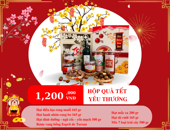 Hộp Hạt Dinh Dưỡng Tặng Tết 2025 Yêu Thương gồm có 7 sản phẩm: + Hạt điều rang muối: 165g + Hạt hạnh nhân rang bơ: 165g + Hạt macca Úc sấy nứt vỏ: 200g + Hạt dẻ cười Mỹ (không tẩy trắng): 165g + Hạt dinh dưỡng ngũ cốc yến mạch: 500g + Mix 7 loại trái cây: 500g + Rượu vang hồng Esprit de Tursan: 750ml |